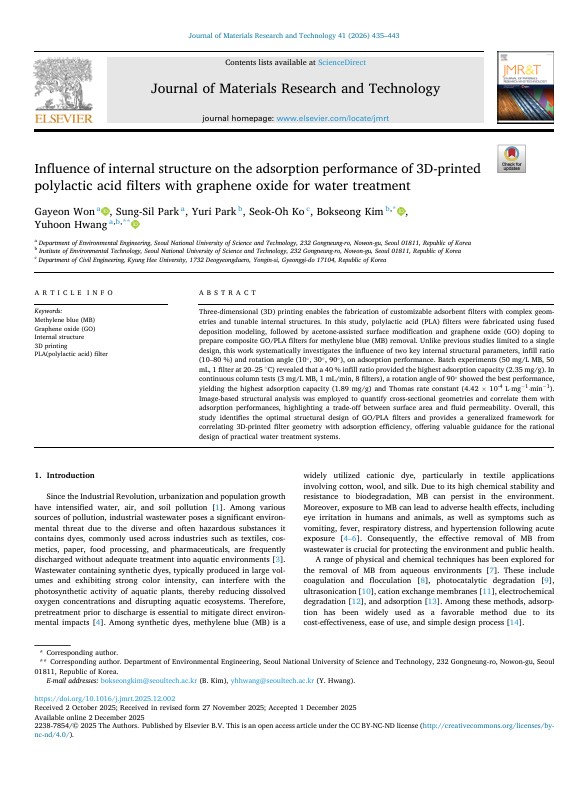 서울과학기술대학교 환경공학과 원가연 석사과정(지도교수: 황유훈)은 금속공학 및 야금공학 분야 상위 10% 이내 저널인 Journal of Materials Research and Technology 최신호에 “Influence of internal structure on the adsorption performance of 3D-printed polylactic acid filters with graphene oxide for water treatment” 논문을 게재하였다.