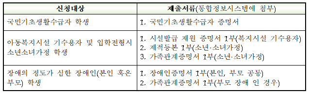 3. 지원대상 : 2025학년도 2학기 재학생 중 아래 조건 대상 학생 ※ 현재시점에 발급받은 서류로 제출 (과거 제출 서류 불인정)